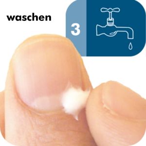 Die zu entfernenden Partien werden mit der Lotion aufgeweicht und mit einem stumpfen Hornhautschaber oder Nagelhautschieber wie Gelee entfernt