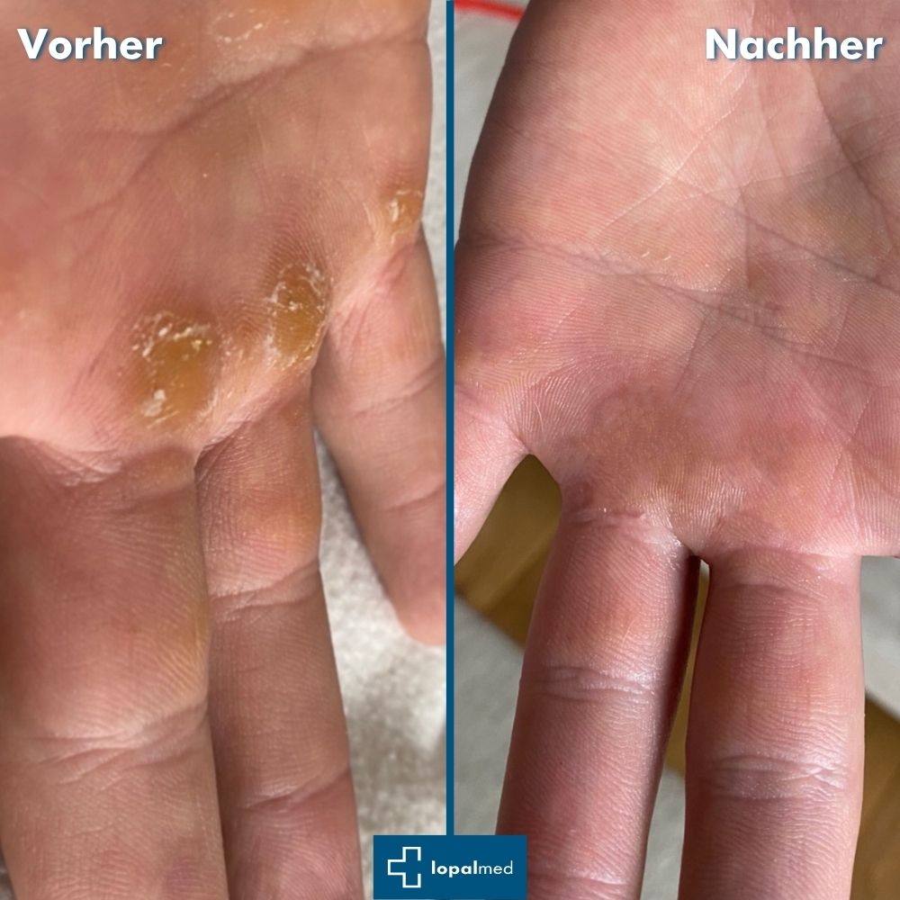 Lopalmed entfernt die Hornhaut besonders schonend und du benötigst keine Werkzeuge, wie Hornhautraspel oder andere mechanische Geräte! Unser Produkt weicht die überschüssige Haut auf und du kannst diese danach einfach mit einem Spatel wegschieben!