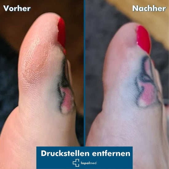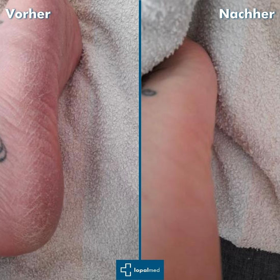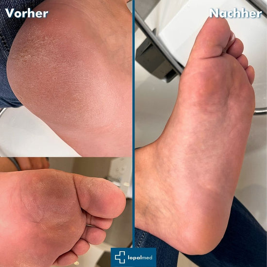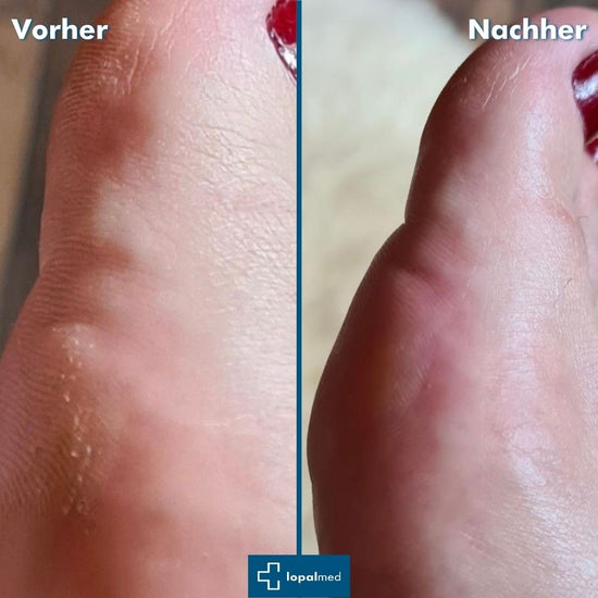 Um nach der Behandlung einer unnatürlich verstärkten Neubildung von Hornhaut entgegenzuwirken, die Füße einfach täglich mit der Lopalmed Aufbaucreme einmassieren. Ergänzend mit der Lopalmed Hornhaut-Reduziercreme täglich eincremen. Die Hornhautneubildung kann so nachhaltig verzögert werden. Diesen Vorgang kannst Du bei den Füßen alle 6 – 7 Tage wiederholen, bis Du nach eigenem Empfinden ein zufrieden stellendes Ergebnis erzielt hast.