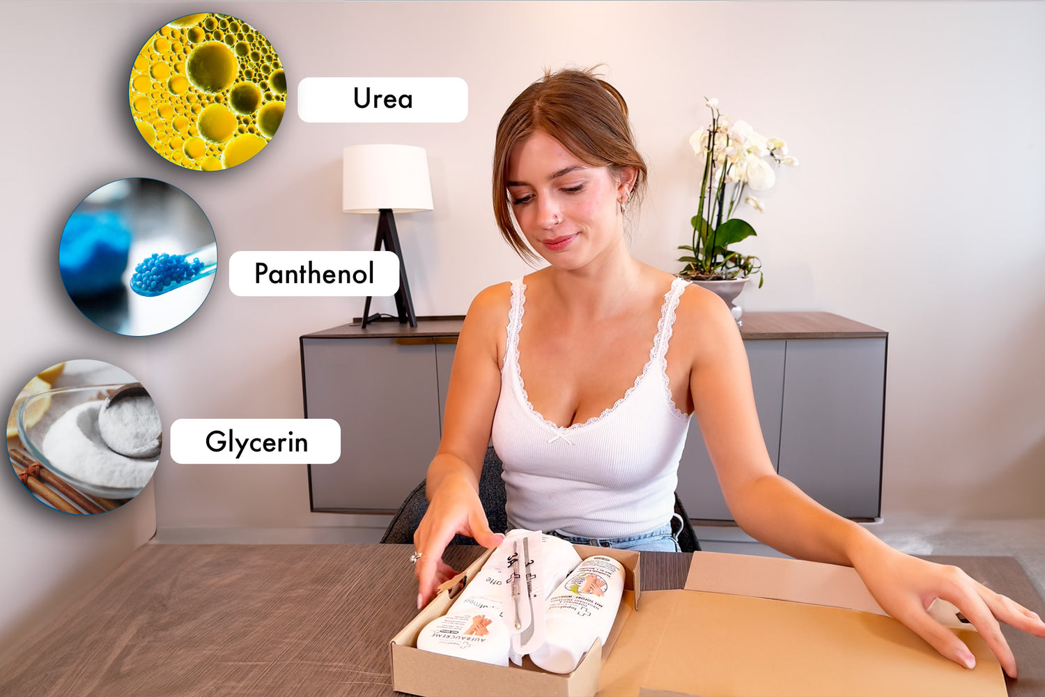 Unsere Formulierungen enthalten bewährte Inhaltsstoffe wie Urea, Panthenol und Glycerin, die bekannt dafür sind, die Haut zu hydratisieren, zu beruhigen und zu regenerieren. Diese Wirkstoffe helfen, die Haut zu glätten und Hornhautbildung vorzubeugen.