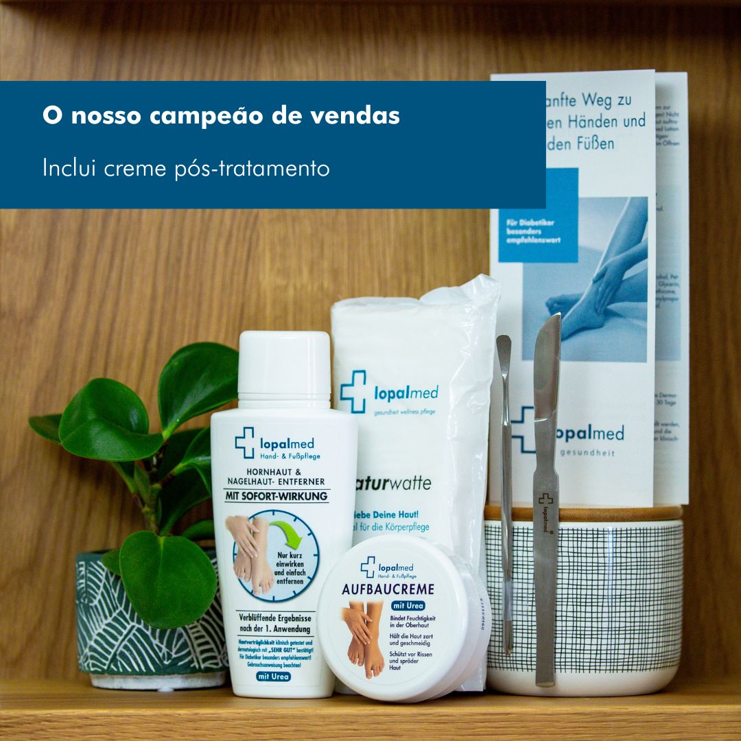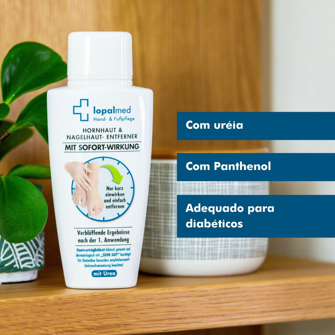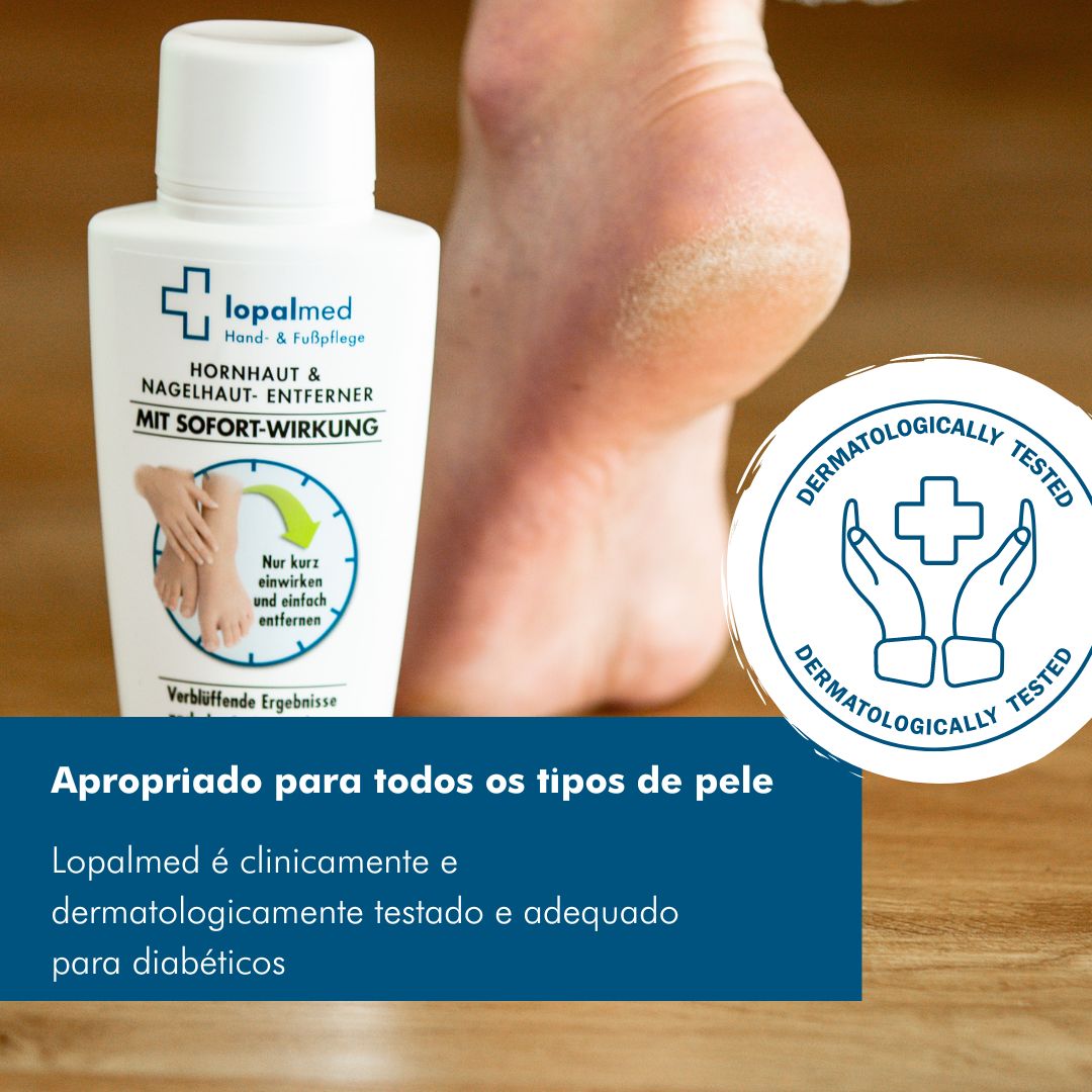 Com a Loção Removedora de Calos e Cutículas Lopalmed, terá a opção de remover suavemente calos e cutículas sem usar pedra-pomes, lima, alisador de calos ou tesoura de cutícula .